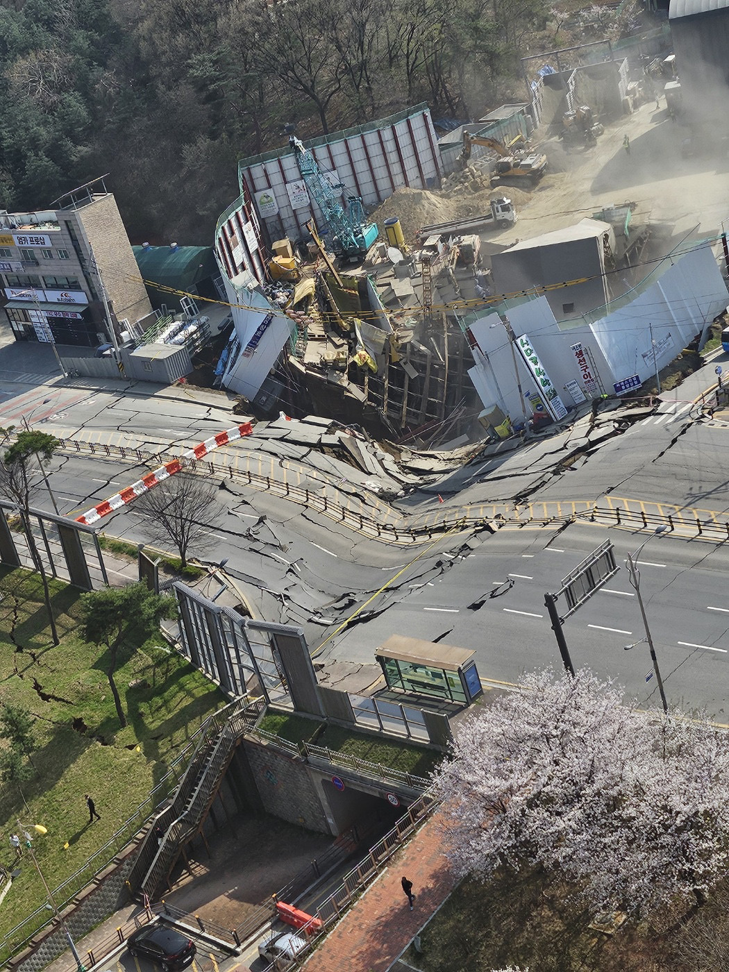 붕괴는 지하에만 그치지 않았습니다. 지하 공간의 붕괴로 인해 상부 도로와 인근 상가 일부도 함께 무너졌습니다.